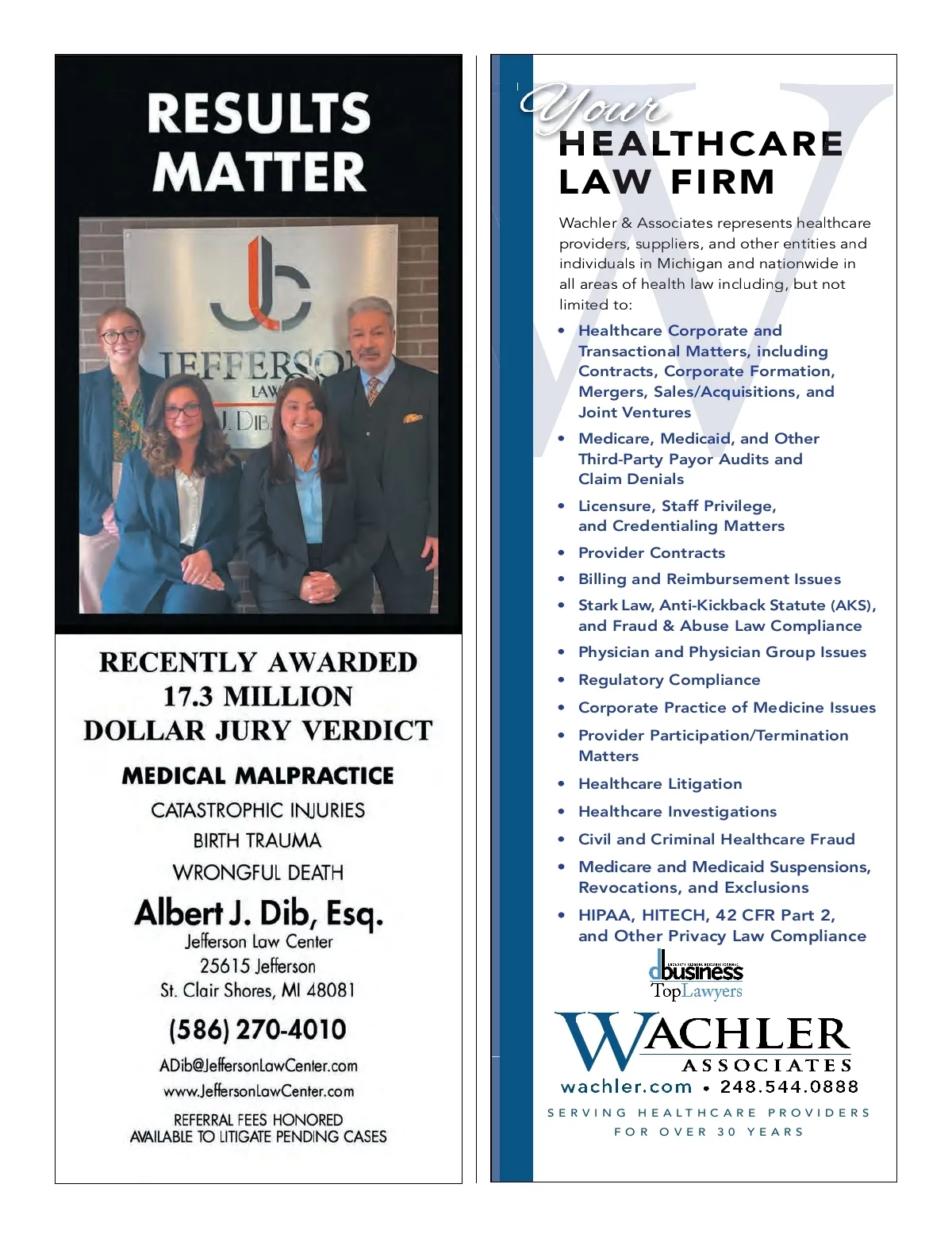 SERVING HEALTH HEA LTHCARE RE LA W FI RM HEALTHCARE OVER 30 FOR YEARS PROVID E R S Wachler chler & Assoc iates represents nts hea lthcare provide rs, supp su liers, and other er entities and individua dua ls in Mic Mi hi gan and nationwi tionwide in all areas of he alth law includin ng, bu t not limite d to: •Healthcare Corporate and Transactional Matters, including •Healthcare Corporate and Contracts, Corporate Formation, Transactional Matters, including Mergers, Sales/Acquisitions, and Contracts, Corporate Formation, Joint Ventures Mergers, Sales/Acquisitions, and • Medicare, Medicaid, and Other Joint Ventures Third-Party Payor Audits and • Medicare, Medicaid, and Other Claim Denials Third-Party Payor Audits and •Licensure, Staff Privilege, Claim Denials and Credentialing Matters •Licensure, Staff Privilege, • Provider Contracts Matters and Credentialing •Billing and Reimbursement Issues • Provider Contracts • Stark Law, Statute (AKS) , •Billing and Anti-Kickback Reimbursement Issues and Fraud & Abuse Law Compliance • Stark Law, Anti-Kickback Statute (AKS) , •Physician Physician Issues and Fraud and & Abuse Law Group Compliance • Regulatory Compliance •Physician and Physician Group Issues •Corporate of Medicine Issues • Regulatory Practice Compliance • Provider Participation/ Termination •Corporate Practice of Medicine Issues Matters • Provider Participation/Termination • Matters Healthcare Litigation • • Healthcare Healthcare Investigations Litigation • Healthcare Civil and Criminal Healthcare Fraud • Investigations • and Medicaid Suspensions, • Medicare Civil and Criminal Healthcare Fraud Revocations, and Exclusions • Medicare and Medicaid Suspensions, • Revocations, HIPAA, HITECH, CFR Part 2, and 42 Exclusions and Other Privacy Law Compliance • HIPAA, HITECH, 42 CFR Part 2, and Other Privacy Law Compliance SERVING HEALTHCARE PROVID E R S FOR OVER 30 YEARS SERVING HEALTHCARE PROVID E R S FOR OVER 30 YEARS