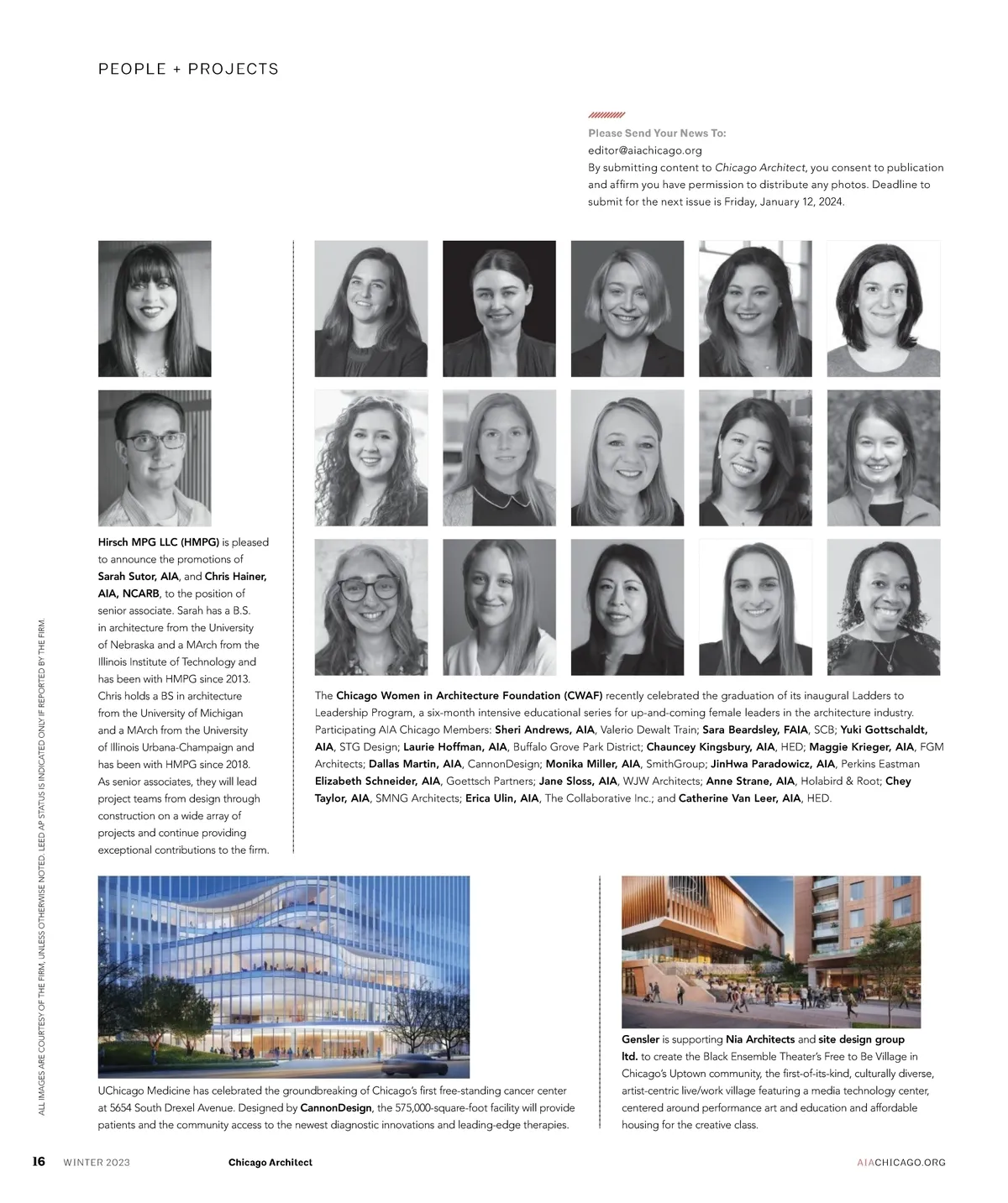 PEOPLE + PROJECTS Please Send Your News To: editor@aiachicago.org By submitting content to Chicago Architect , you consent to publication and affirm you have permission to distribute any photos. Deadline to submit for the next issue is Friday, January 12, 2024. Hirsch MPG LLC (HMPG) is pleased to announce the promotions of Sarah Sutor, AIA , and Chris Hainer, AIA, NCARB , to the position of senior associate. Sarah has a B.S. ALL IMAGES ARE COURTESY OF THE FIRM, UNLESS OTHERWISE NOTED. LEED AP STATUS IS INDICATED ONLY IF REPORTED BY THE FIRM. in architecture from the University of Nebraska and a MArch from the Illinois Institute of Technology and has been with HMPG since 2013. Chris holds a BS in architecture from the University of Michigan and a MArch from the University of Illinois Urbana-Champaign and has been with HMPG since 2018. As senior associates, they will lead project teams from design through construction on a wide array of projects and continue providing exceptional contributions to the firm. The Chicago Women in Architecture Foundation (CWAF) recently celebrated the graduation of its inaugural Ladders to Leadership Program, a six-month intensive educational series for up-and-coming female leaders in the architecture industry. Participating AIA Chicago Members: Sheri Andrews, AIA , Valerio Dewalt Train; Sara Beardsley, FAIA , SCB; Yuki Gottschaldt, AIA , STG Design; Laurie Hoffman, AIA , Buffalo Grove Park District; Chauncey Kingsbury, AIA , HED; Maggie Krieger, AIA , FGM Architects; Dallas Martin, AIA , CannonDesign; Monika Miller, AIA , SmithGroup; JinHwa Paradowicz, AIA , Perkins Eastman Elizabeth Schneider, AIA , Goettsch Partners; Jane Sloss, AIA , WJW Architects; Anne Strane, AIA , Holabird & Root; Chey Taylor, AIA , SMNG Architects; Erica Ulin, AIA , The Collaborative Inc.; and Catherine Van Leer, AIA , HED. Gensler is supporting Nia Architects and site design group ltd. to create the Black Ensemble Theater’s Free to Be Village in Chicago’s Uptown community, the first-of-its-kind, culturally diverse, UChicago Medicine has celebrated the groundbreaking of Chicago’s first free-standing cancer center at 5654 South Drexel Avenue. Designed by CannonDesign , the 575,000-square-foot facility will provide patients and the community access to the newest diagnostic innovations and leading-edge therapies. artist-centric live/work village featuring a media technology center, centered around performance art and education and affordable housing for the creative class. AIA CHICAGO.ORG 16 WINTER 2023 Chicago Architect