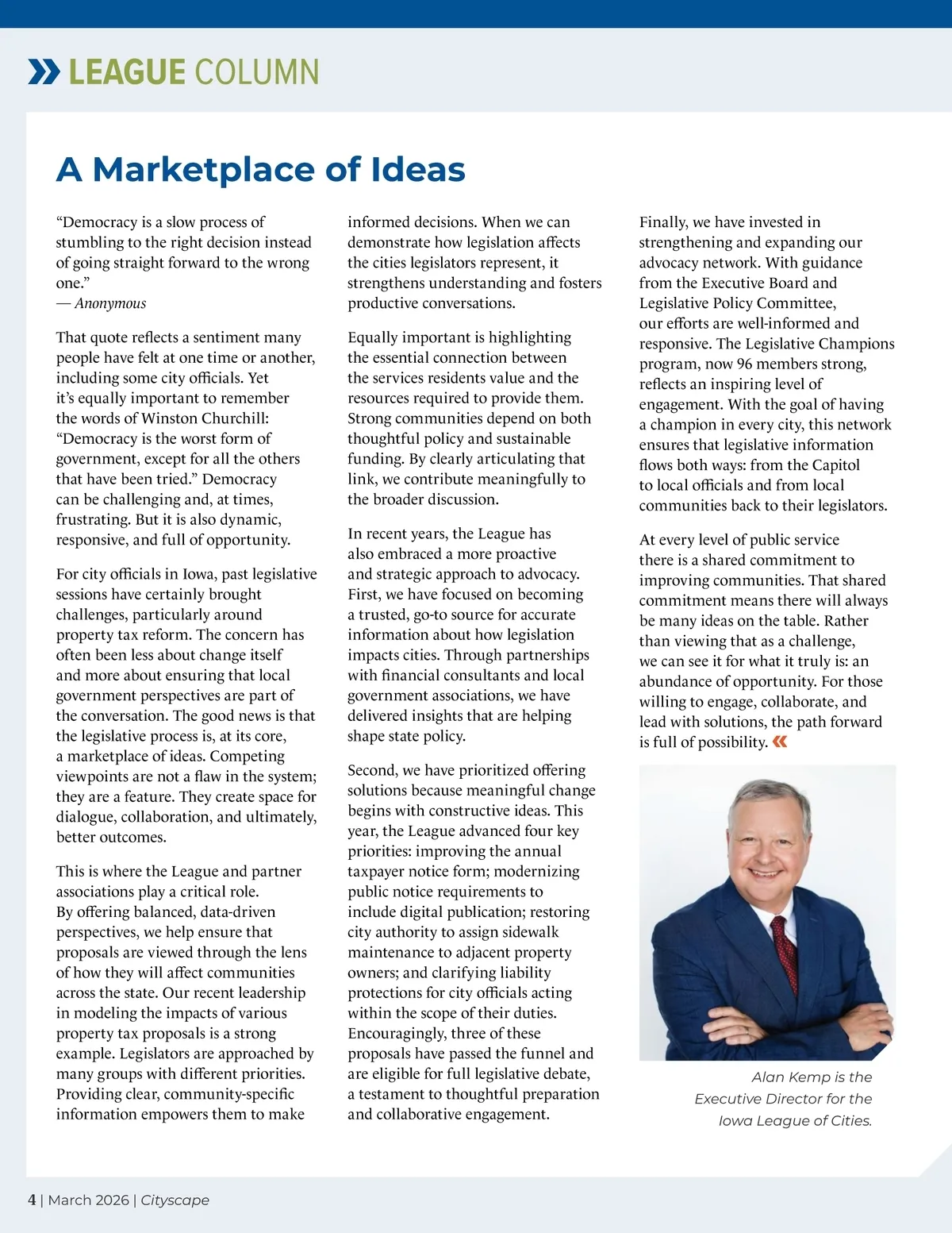 LEAGUE COLUMN A Marketplace of Ideas “Democracy is a slow process of stumbling to the right decision instead of going straight forward to the wrong one.” — Anonymous That quote reflects a sentiment many people have felt at one time or another, including some city officials. Yet it’s equally important to remember the words of Winston Churchill: “Democracy is the worst form of government, except for all the others that have been tried.” Democracy can be challenging and, at times, frustrating. But it is also dynamic, responsive, and full of opportunity. For city officials in Iowa, past legislative sessions have certainly brought challenges, particularly around property tax reform. The concern has often been less about change itself and more about ensuring that local government perspectives are part of the conversation. The good news is that the legislative process is, at its core, a marketplace of ideas. Competing viewpoints are not a flaw in the system; they are a feature. They create space for dialogue, collaboration, and ultimately, better outcomes. This is where the League and partner associations play a critical role. By offering balanced, data-driven perspectives, we help ensure that proposals are viewed through the lens of how they will affect communities across the state. Our recent leadership in modeling the impacts of various property tax proposals is a strong example. Legislators are approached by many groups with different priorities. Providing clear, community-specific information empowers them to make informed decisions. When we can demonstrate how legislation affects the cities legislators represent, it strengthens understanding and fosters productive conversations. Equally important is highlighting the essential connection between the services residents value and the resources required to provide them. Strong communities depend on both thoughtful policy and sustainable funding. By clearly articulating that link, we contribute meaningfully to the broader discussion. In recent years, the League has also embraced a more proactive and strategic approach to advocacy. First, we have focused on becoming a trusted, go-to source for accurate information about how legislation impacts cities. Through partnerships with financial consultants and local government associations, we have delivered insights that are helping shape state policy. Second, we have prioritized offering solutions because meaningful change begins with constructive ideas. This year, the League advanced four key priorities: improving the annual taxpayer notice form; modernizing public notice requirements to include digital publication; restoring city authority to assign sidewalk maintenance to adjacent property owners; and clarifying liability protections for city officials acting within the scope of their duties. Encouragingly, three of these proposals have passed the funnel and are eligible for full legislative debate, a testament to thoughtful preparation and collaborative engagement. Finally, we have invested in strengthening and expanding our advocacy network. With guidance from the Executive Board and Legislative Policy Committee, our efforts are well-informed and responsive. The Legislative Champions program, now 96 members strong, reflects an inspiring level of engagement. With the goal of having a champion in every city, this network ensures that legislative information flows both ways: from the Capitol to local officials and from local communities back to their legislators. At every level of public service there is a shared commitment to improving communities. That shared commitment means there will always be many ideas on the table. Rather than viewing that as a challenge, we can see it for what it truly is: an abundance of opportunity. For those willing to engage, collaborate, and lead with solutions, the path forward is full of possibility. Alan Kemp is the Executive Director for the Iowa League of Cities. 4 | March 2026 | Cityscape